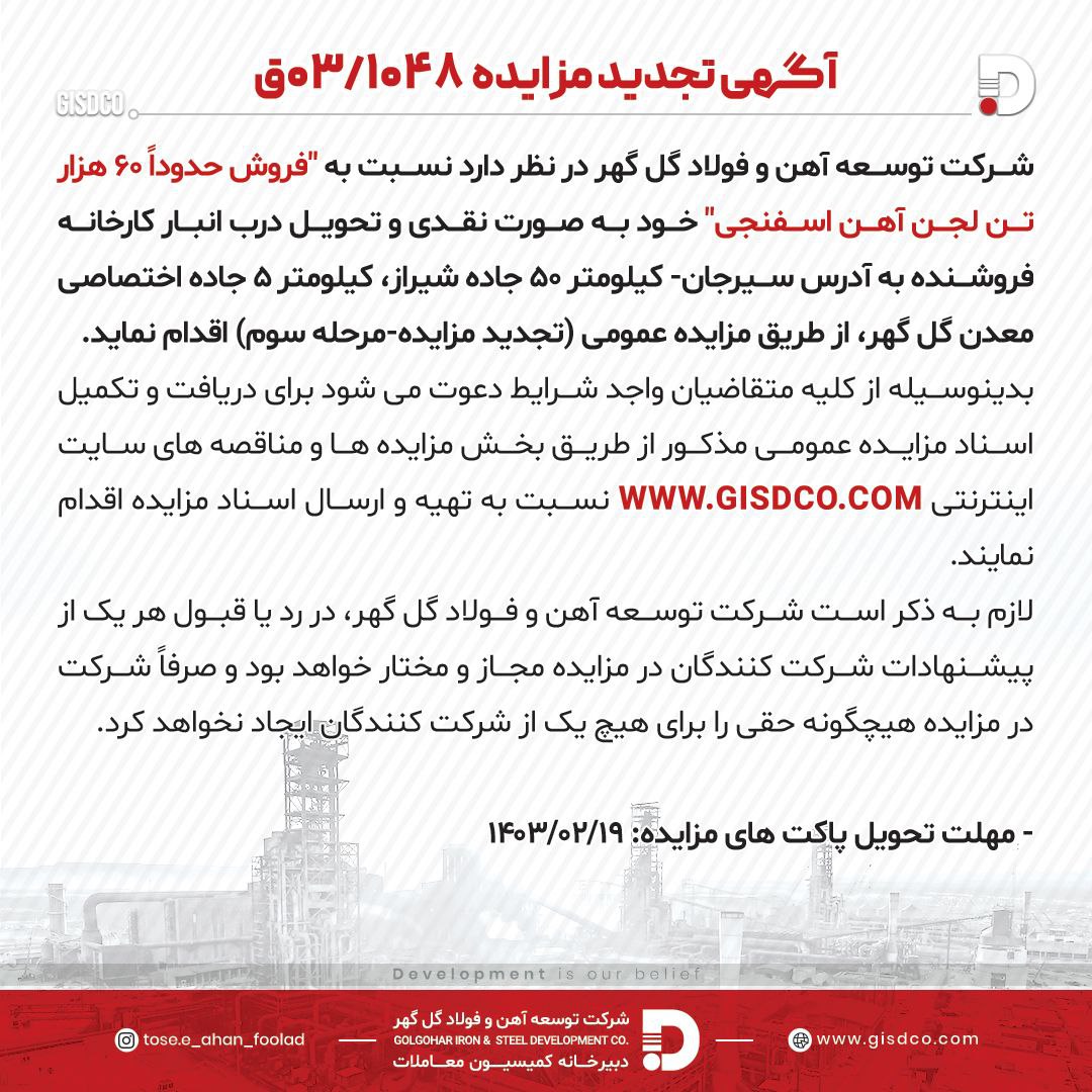 توسعه آهن و فولاد گل گهر بهار ۱۴۰۳ مزایده