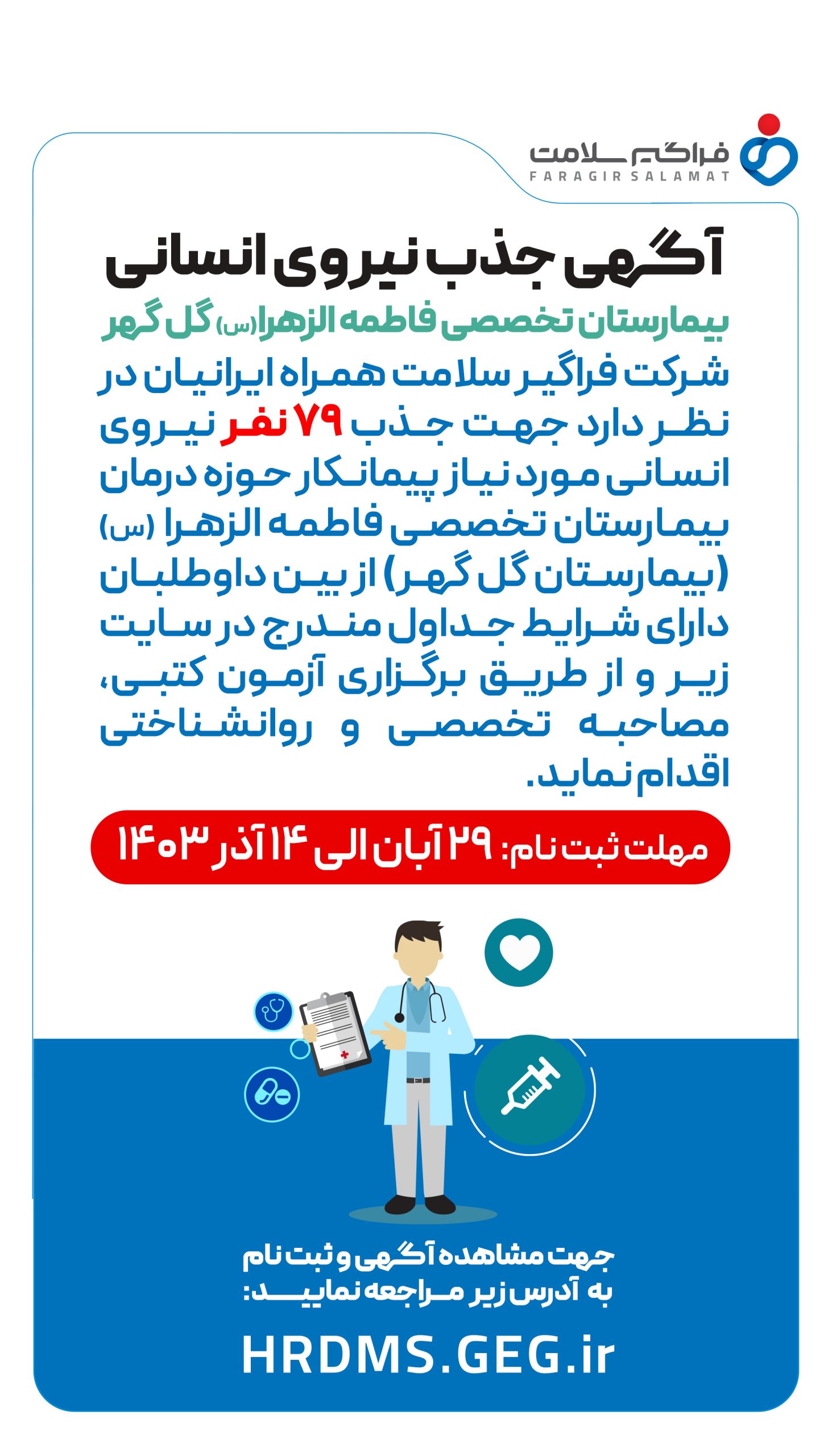 شرکت فراگیر سلامت همراه ایرانیان در نظر دارد جهت جذب ۷۹ نفر نیروی انسانی مورد نیاز پیمانکار حوزه درمان بیمارستان تخصصی فاطمه الزهرا (س) از بین داوطلبان دارای شرایط جداول مندرج در این آگهی و از طریق برگزاری آزمون کتبی، مصاحبه تخصصی و روانشناختی اقدام نماید.