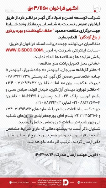 آگهی فراخوان ۰۳/۱۱۵۰ق شناسه خبر: 20504 تاریخ و زمان ارسال: 26 مهر 1403 ساعت 6:47 آگهی فراخوان حفظ، نگهداشت و بهره برداری از باغ آزادگان