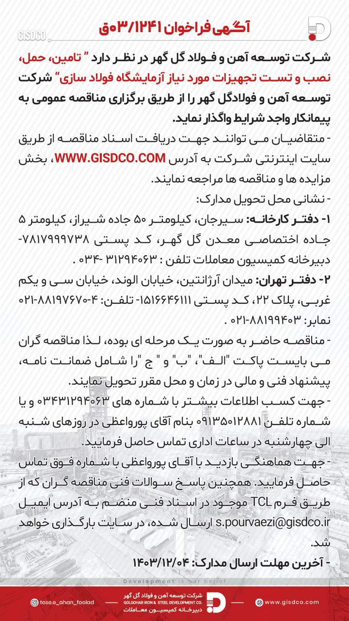 آگهی فراخوان ۰۳/۱۲۴۱ق