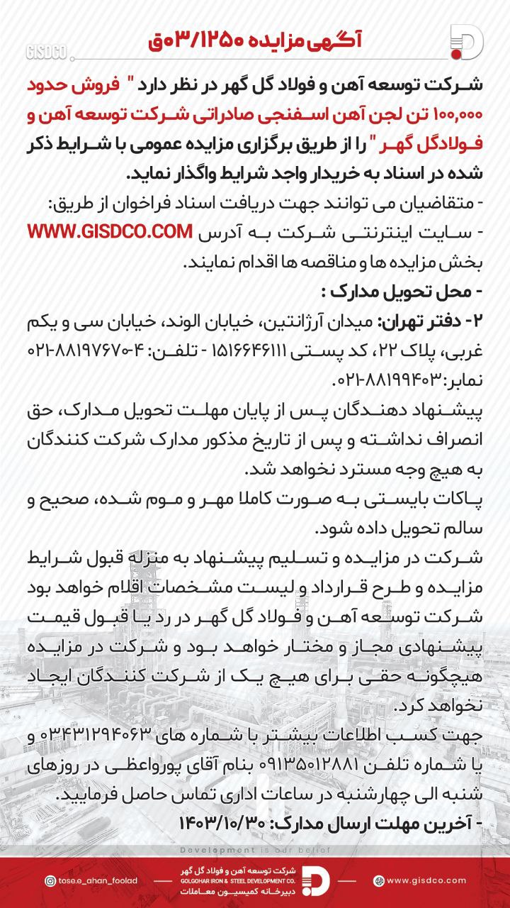 آگهی مزایده ۰۳/۱۲۵۰ق شناسه خبر: 21592 تاریخ و زمان ارسال: 22 دی 1403 ساعت 21:34 فروش حدود ۱۰۰.۰۰۰ تن لجن آهن اسفنجی صادراتی شرکت توسعه آهن و فولاد گل گهر