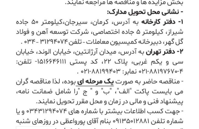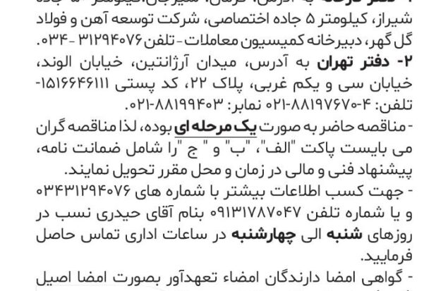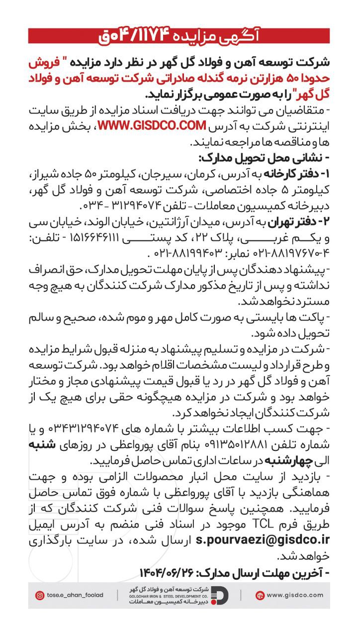 آگهی مزایده ۰۴/۱۱۷۴ ق شناسه خبر: 22259 تاریخ و زمان ارسال: 23 شهریور 1404 ساعت 15:11 فروش حدودا ۵۰ هزارتن نرمه گندله صادراتى شرکت توسعه ٱهن و فولاد گلگهر