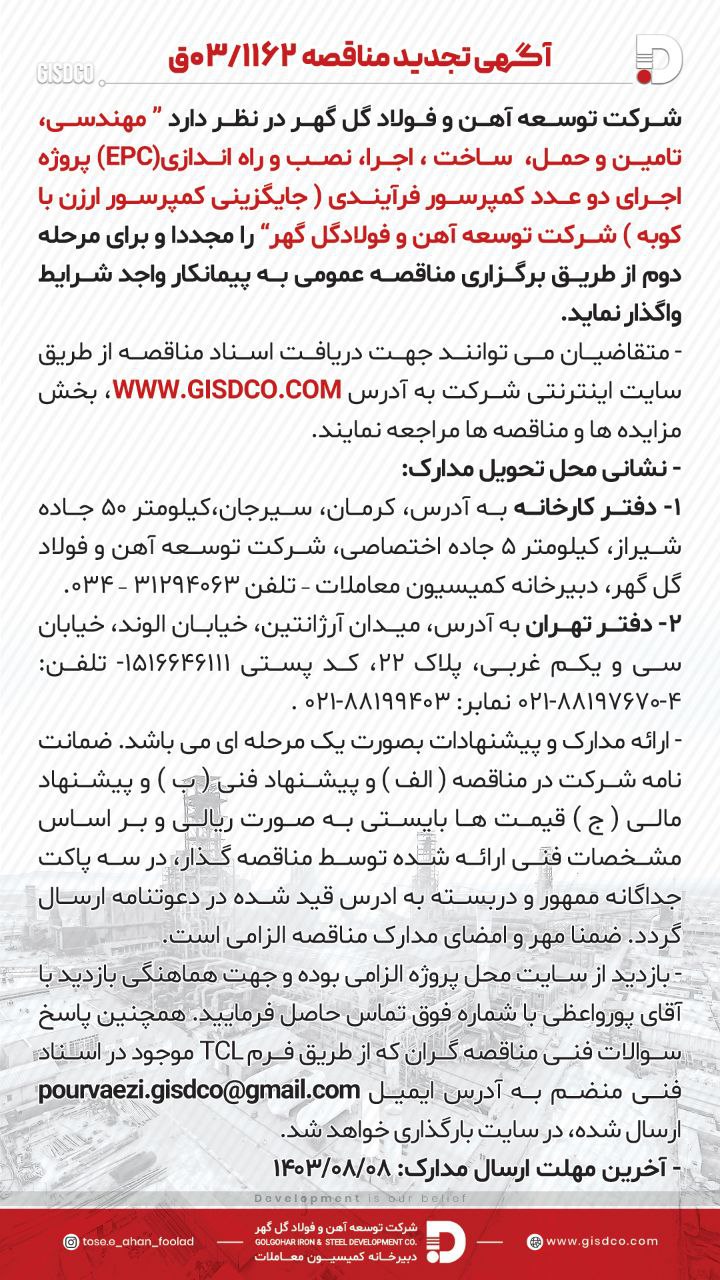 آگهی مناقصه ۰۳/۱۱۶۲ق