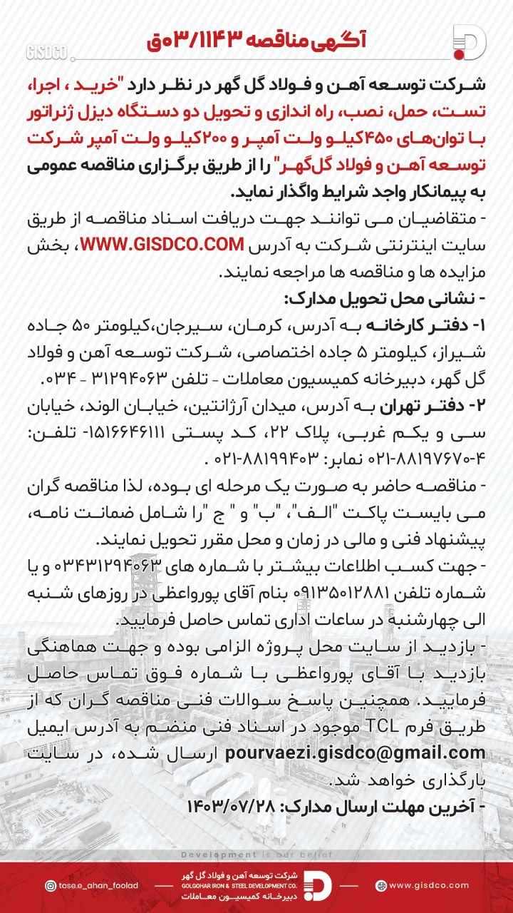 آگهی مناقصه ۰۳/۱۱۴۳ق