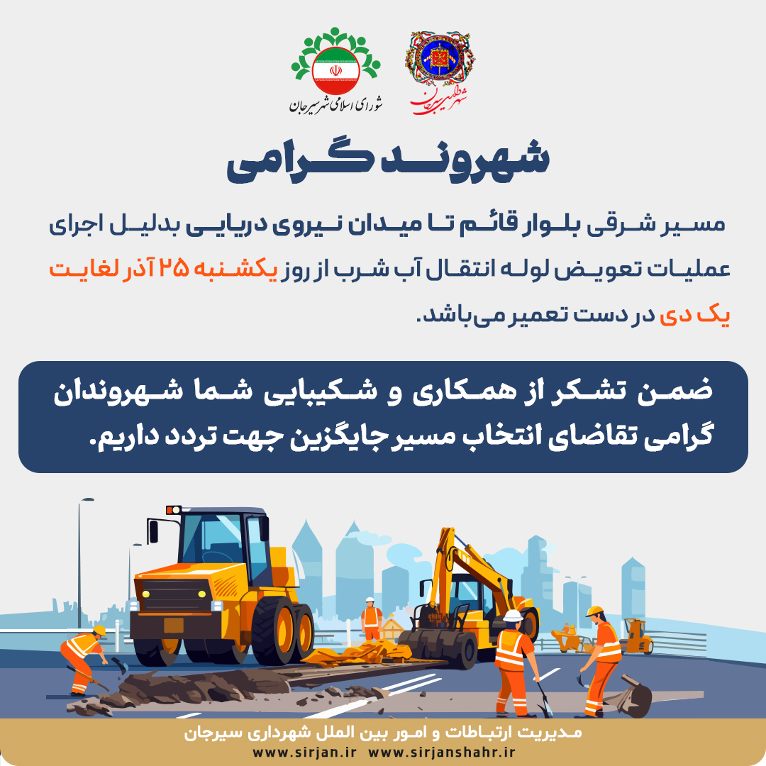اطلاعیه مسدودی مسیر شرقی بلوار قائم تا میدان نیروی دریایی