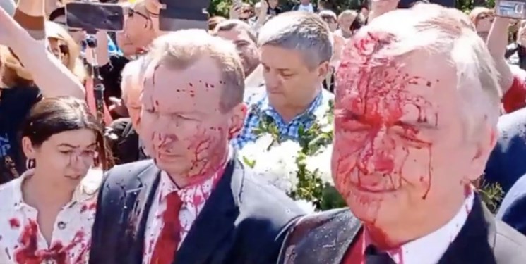 «سرگئی آندریف» سفیر روسیه در لهستان در مراسم اهدای تاج گل و ادای احترام به سربازان ارتش سرخ که در طول جنگ جهانی دوم جان باختند، در ورشو با رنگ قرمز مورد حمله قرار گرفت.