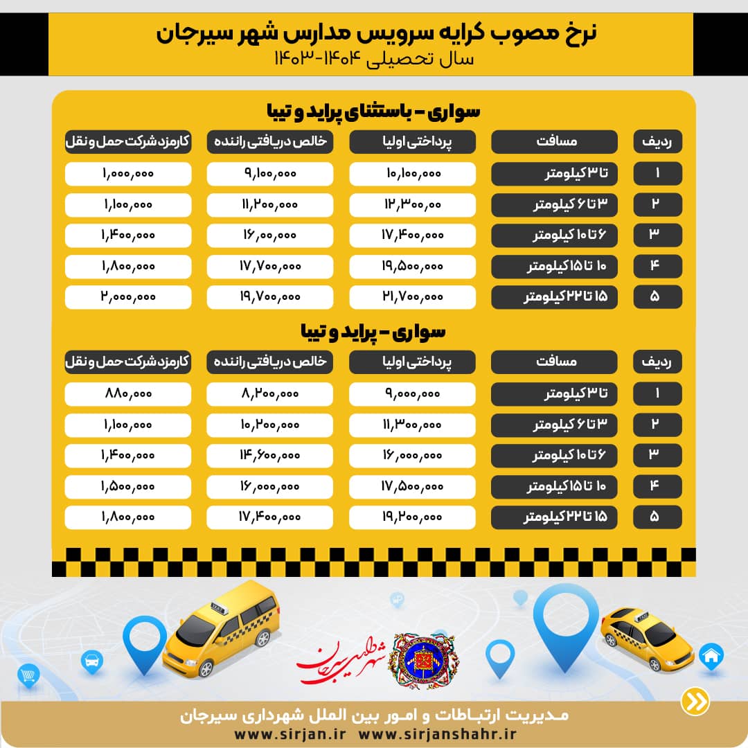 به گزارش واحد خبر مدیریت ارتباطات شهرداری سیرجان، جواد نویدی با اعلام این خبر افزود: پس از طرح و موافقت شورای شهر سیرجان، نرخنامه جدید سرویس مدارس در سال تحصیلی جدید ۴۵ درصد افزایش یافت و مقرر شد معاینه فنی و سال تولید خودرو لحاظ شود.