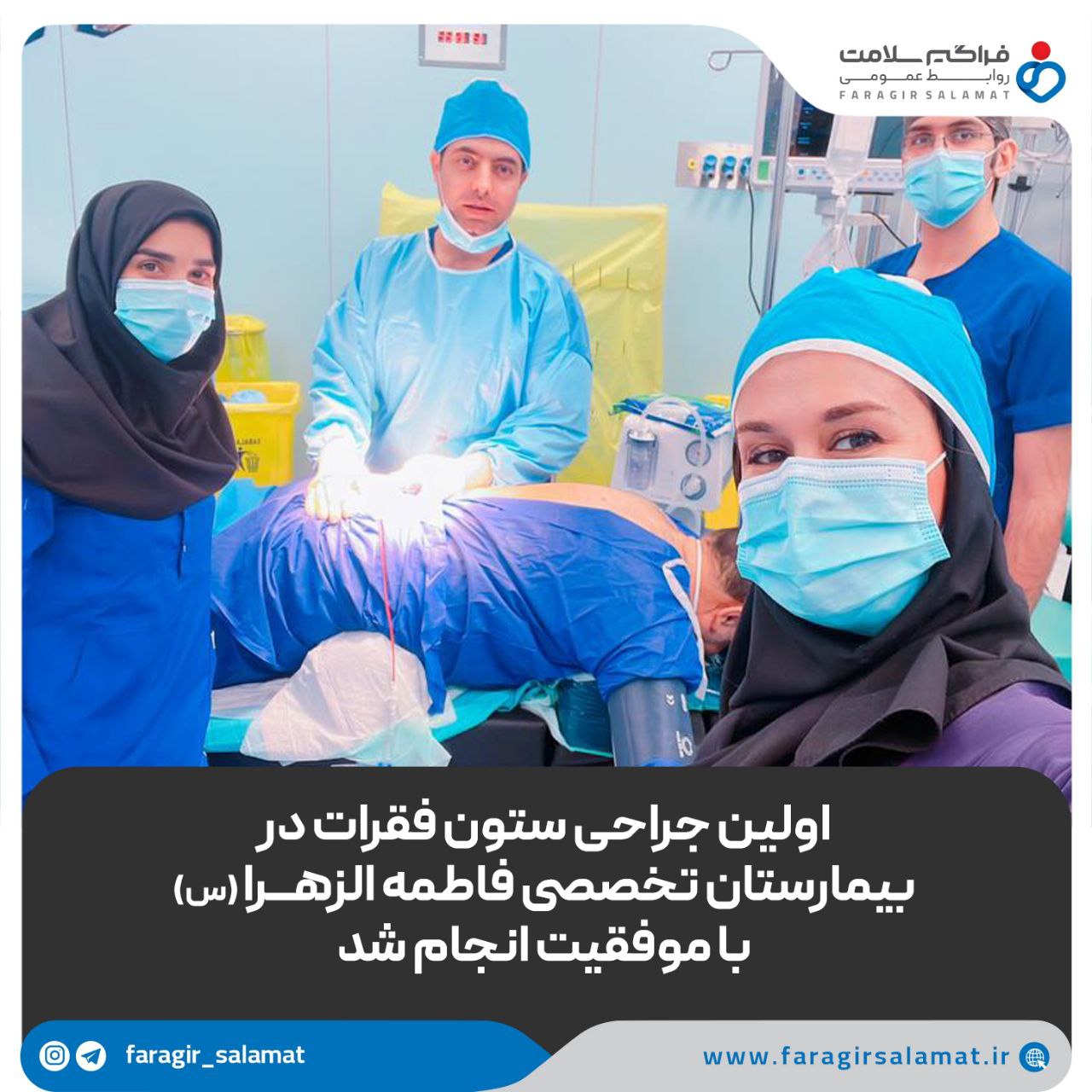 به گزارش روابط عمومی بیمارستان فاطمه الزهرا (س) فراگیر سلامت نخستین جراحی ستون فقرات در این مرکز درمانی با موفقیت انجام شد. این عمل جراحی توسط دکتر مریم بهشتیان متخصص مغز و اعصاب و ستون فقرات که از پزشکان مجرب و متعهد این بیمارستان است انجام گرفت.