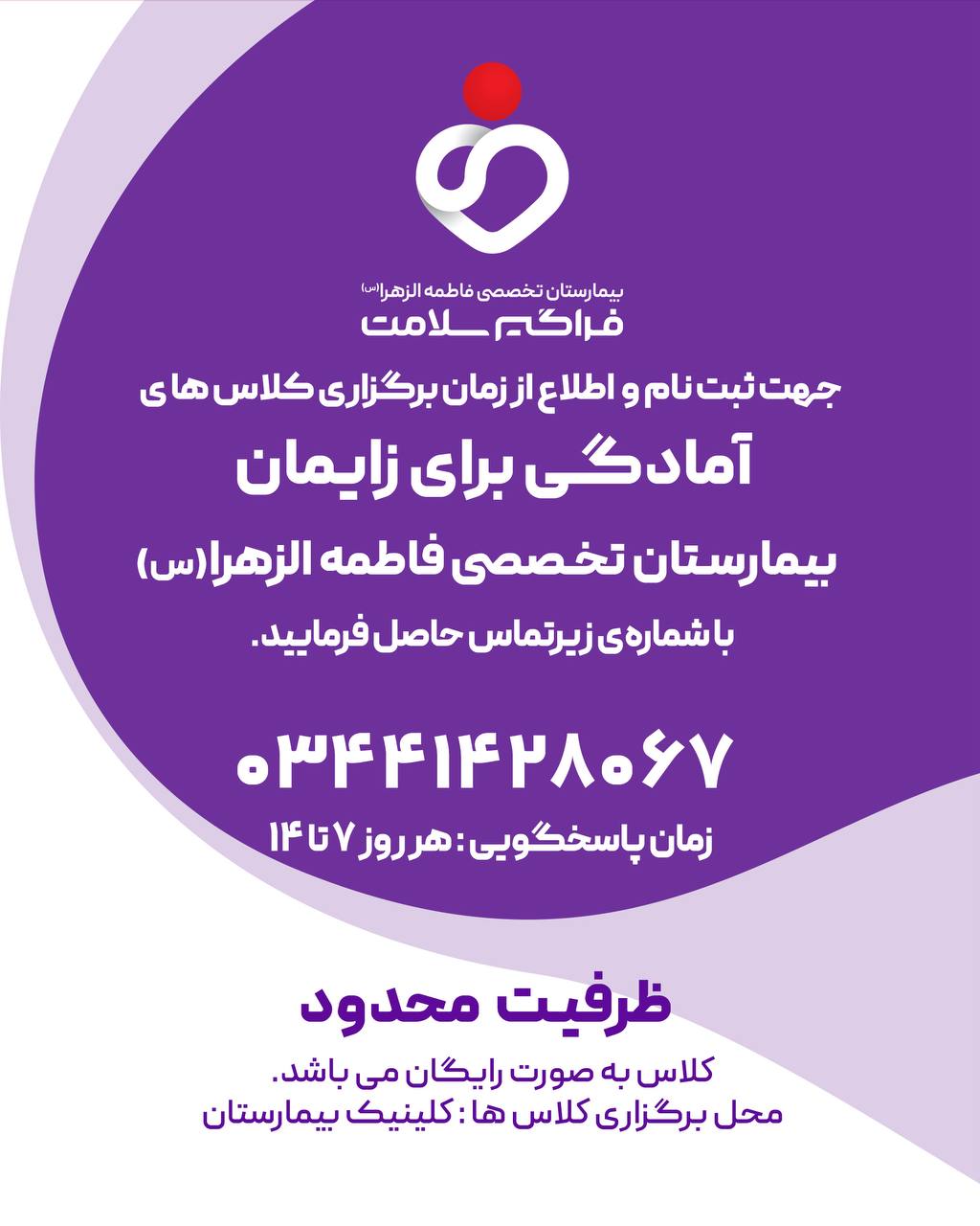 کلاس‌های رایگان دوران بارداری در بیمارستان تخصصی فاطمه‌الزهرا (س) فراگیر سلامت، همراه شماست تا با آمادگی کامل، زایمانی آرام و طبیعی را تجربه کنید.