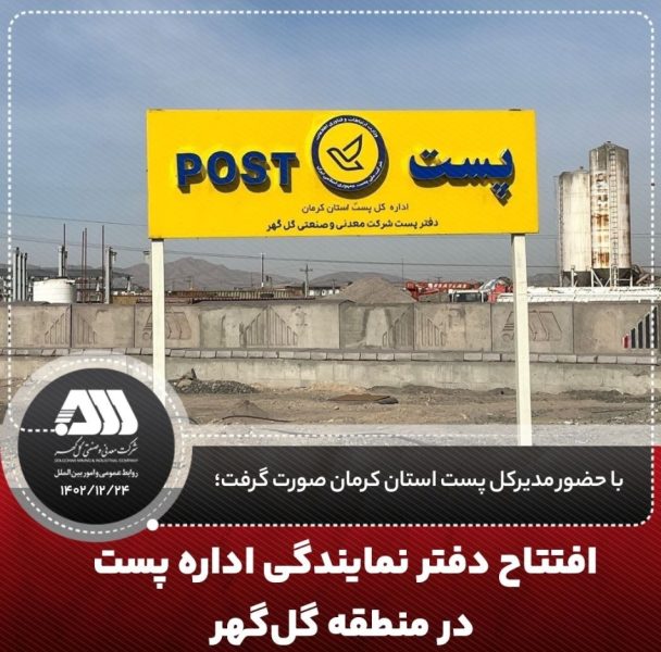 طی مراسمی با حضور مدیر کل پست استان کرمان و چند تن از معاونین و مدیران شرکت معدنی و صنعتی گلگهر، دفتر نمایندگی پست در منطقه گلگهر و در مجاورت سر درب جدید این شرکت افتتاح و فعالیت رسمی خود را آغاز کرد.