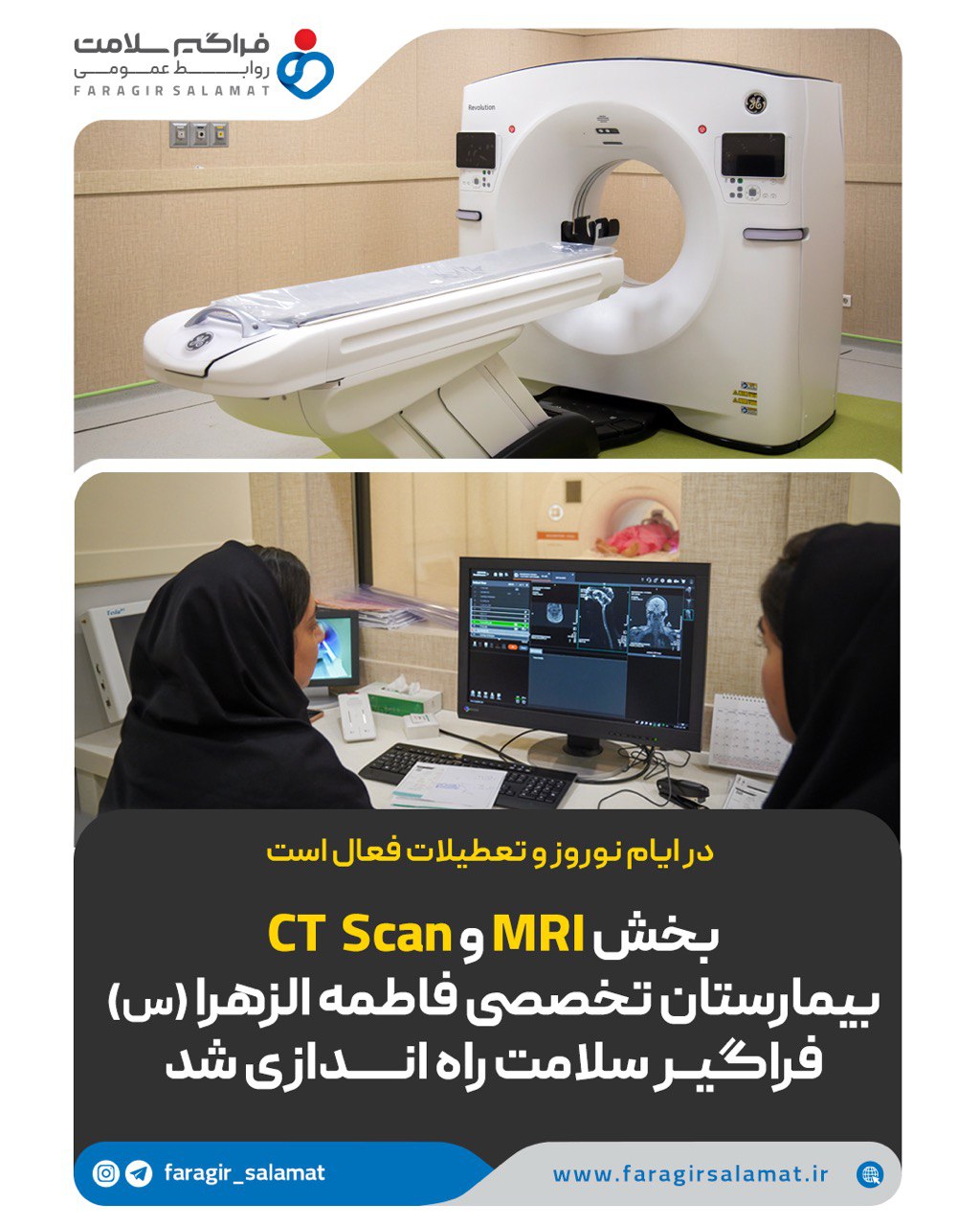 بخش MRI و CT SCAN بیمارستان تخصصی فاطمهالزهرا (س) فراگیر سلامت که پیشتر تجهیز شده بود، از ۱ فروردین ۱۴۰۴ بهطور رسمی فعال و آماده ارائه خدمات به بیماران خواهد شد