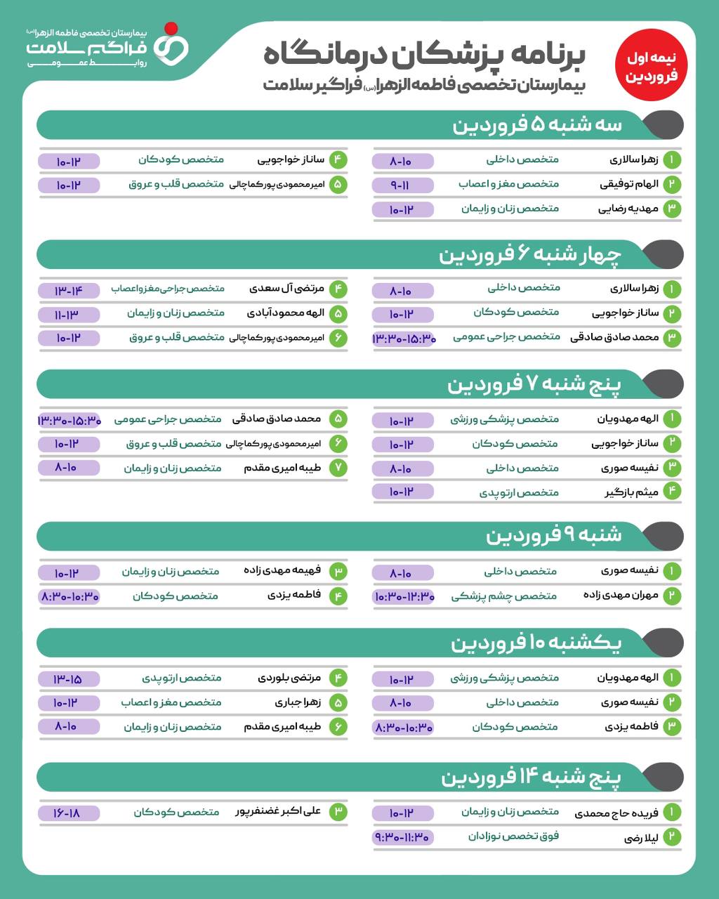 برنامه نوبت‌دهی پزشکان درمانگاه تخصصی بیمارستان فاطمه‌الزهرا (س) در ایام نوروز و نیمه اول فروردین ماه اعلام شد