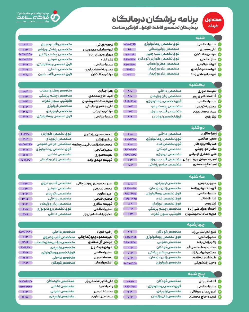 برنامه هفته اول خرداد ماه۱۴۰ پزشکان درمانگاه بیمارستان تخصصی فاطمهالزهرا(س) فراگیر سلامت