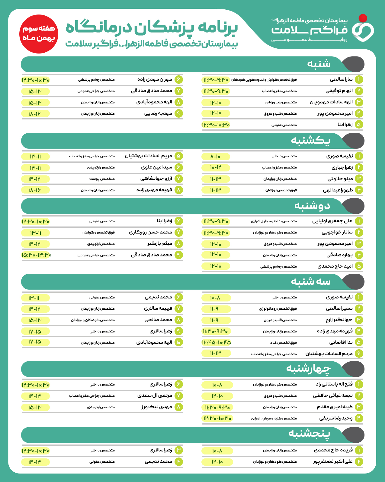 برنامه پزشکان درمانگاه بیمارستان تخصصی فاطمهالزهرا(س) فراگیر سلامت در هفته سوم بهمن ۱۴۰۳