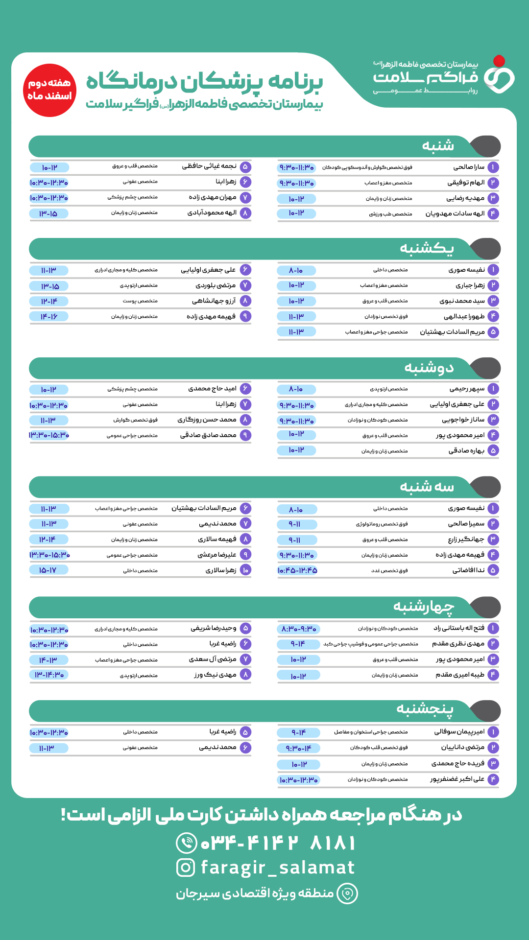 برنامه پزشکان درمانگاه بیمارستان تخصصی فاطمه‌الزهرا(س) فراگیر سلامت هفته دوم اسفند ۱۴۰۳