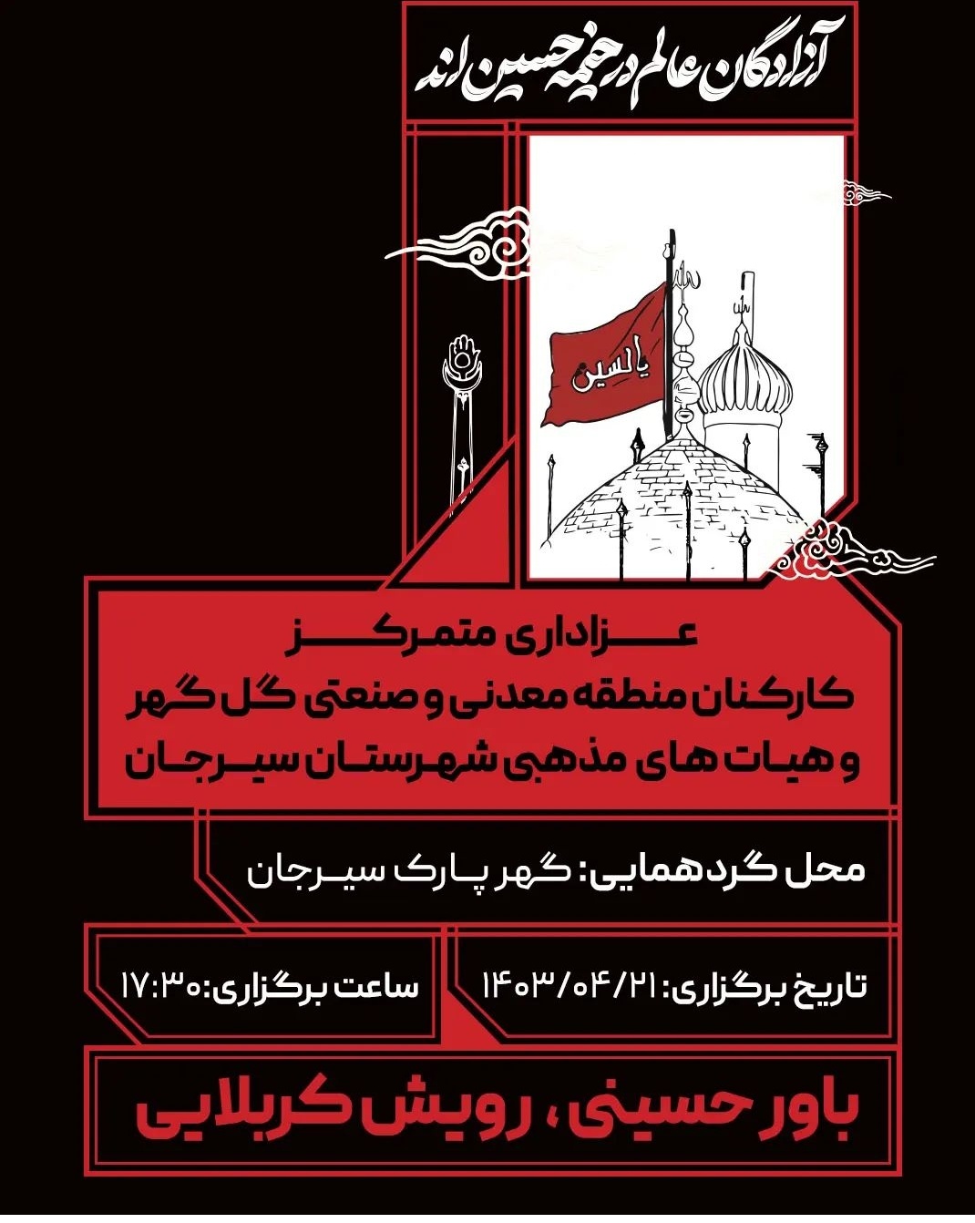 عزاداری متمرکز کارکنان منطقه معدنی و صنعتی گلگهر و هیاتهای مذهبی شهرستان سیرجان شناسه خبر: 19149 تاریخ و زمان ارسال: 20 خرداد 1403 ساعت 8:23 باور حسینی، رویش کربلایی
