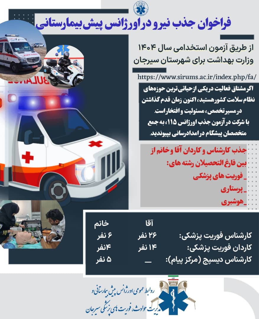 اگر مشتاق فعالیت در یکی از حیاتی ترین حوزه های نظام سلامت کشور هستید اکنون زمان قدم گذاشتن در مسیر تخصص، مسئولیت و افتخار است. با شرکت در آزمون جذب اورژانس ۱۱۵، به جمع متخصصان پیشگام در امدادرسانی بپیوندید.