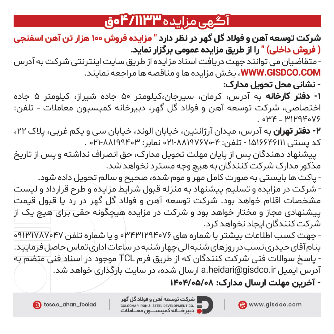 آگهی مزایده ۰۴/۱۱۳۳ ق شناسه خبر: 21999 تاریخ و زمان ارسال: 4 مرداد 1404 ساعت 19:29 مزایده فروش ۱۰۰ هزار تن آهن اسفنجی