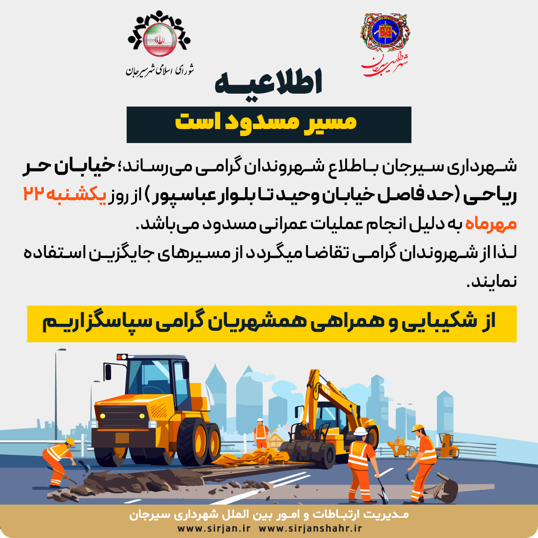 اطلاعیه مسیر مسدود است(خیابان حر ریاحی-حدفاصل خیابان وحید تا بلوار عباسپور)
