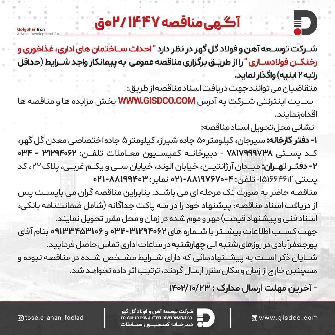 مناقصه ۰۲/۱۴۷۷ق شناسه خبر: 18681 تاریخ و زمان ارسال: 3 دی 1402 ساعت 6:27 آگهی مناقصه ۰۲/۱۴۴۷احداث ساختمان های اداری، غذاخوری و رختکن فولاد سازی