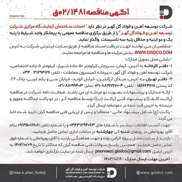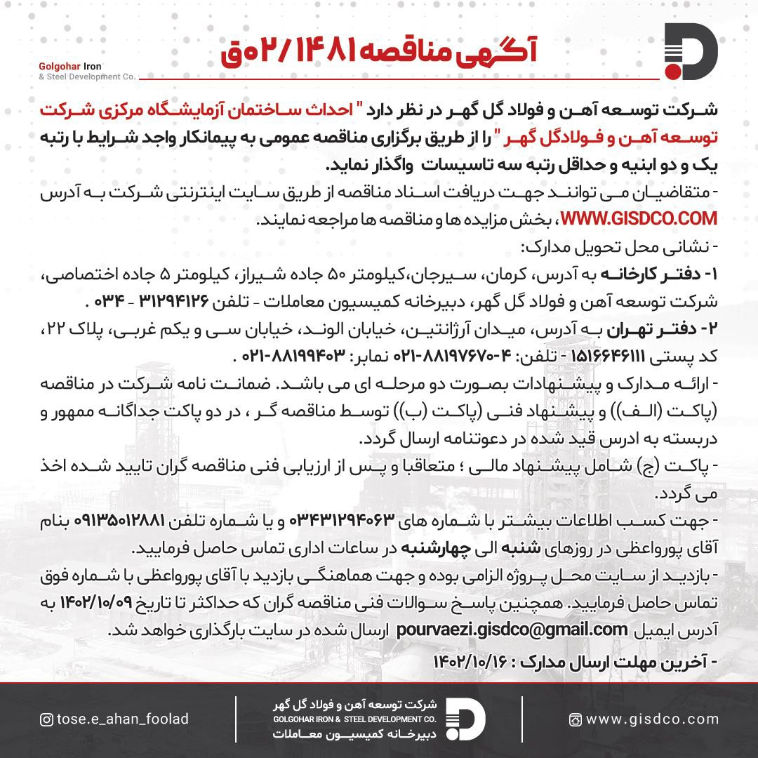 مناقصه ۰۲/۱۴۸۱ق شناسه خبر: 18671 تاریخ و زمان ارسال: 3 دی 1402 ساعت 6:02 آگهی مناقصه ۰۲/۱۴۸۱احداث ساختمان آزمایشگاه مرکزی شرکت توسعه آهن و فولاد گل گهر