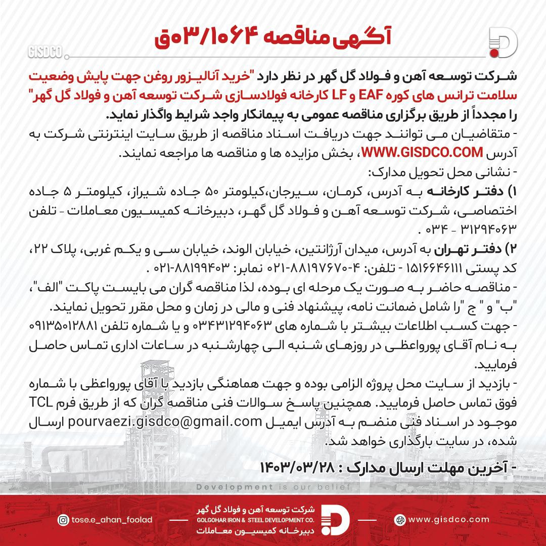 خرید آنالیزور روغن جهت پایش وضعیت سلامت ترانس های کوره EAF و LF کارخانه فولاد سازی شرکت توسعه آهن و فولاد گل گهر