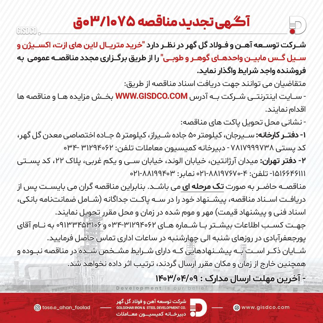 آگهی تجدید مناقصه ۰۳/۱۰۷۵