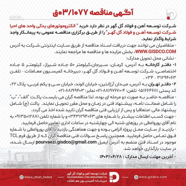 خرید الکتروموتور های یدکی واحد‌های احیا شرکت توسعه آهن و فولاد گل گهر