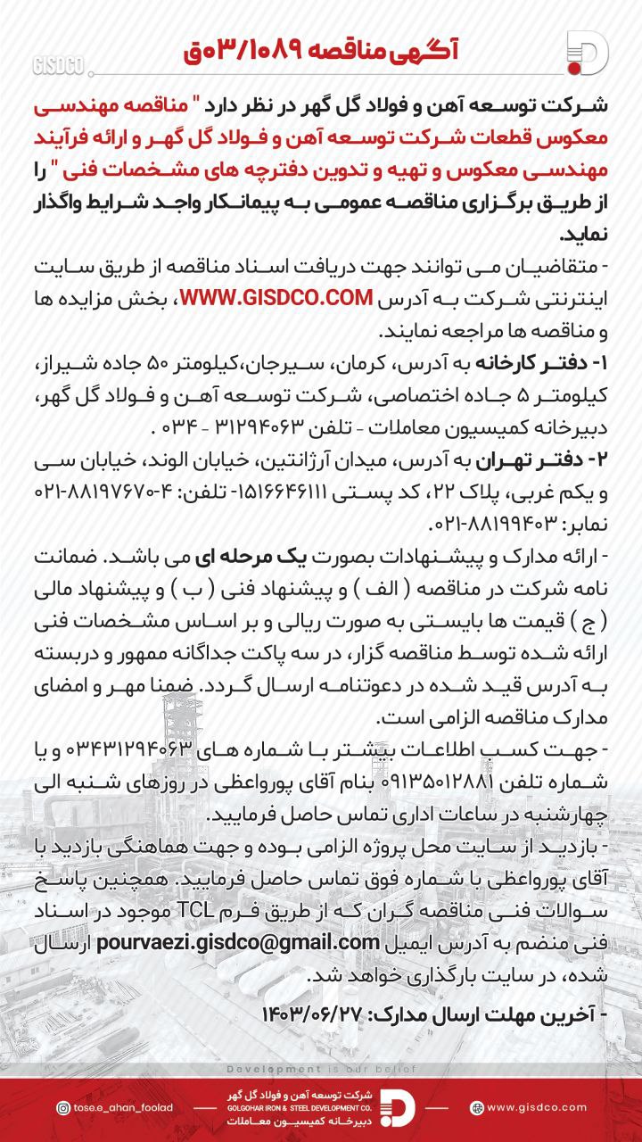 مناقصه مهندسی معکوس قطعات شرکت توسعه آهن و فولاد گل گهر و ارائه فرآیند مهندسی معکوس و تهیه و تدوین دفترچه های مشخصات فنی