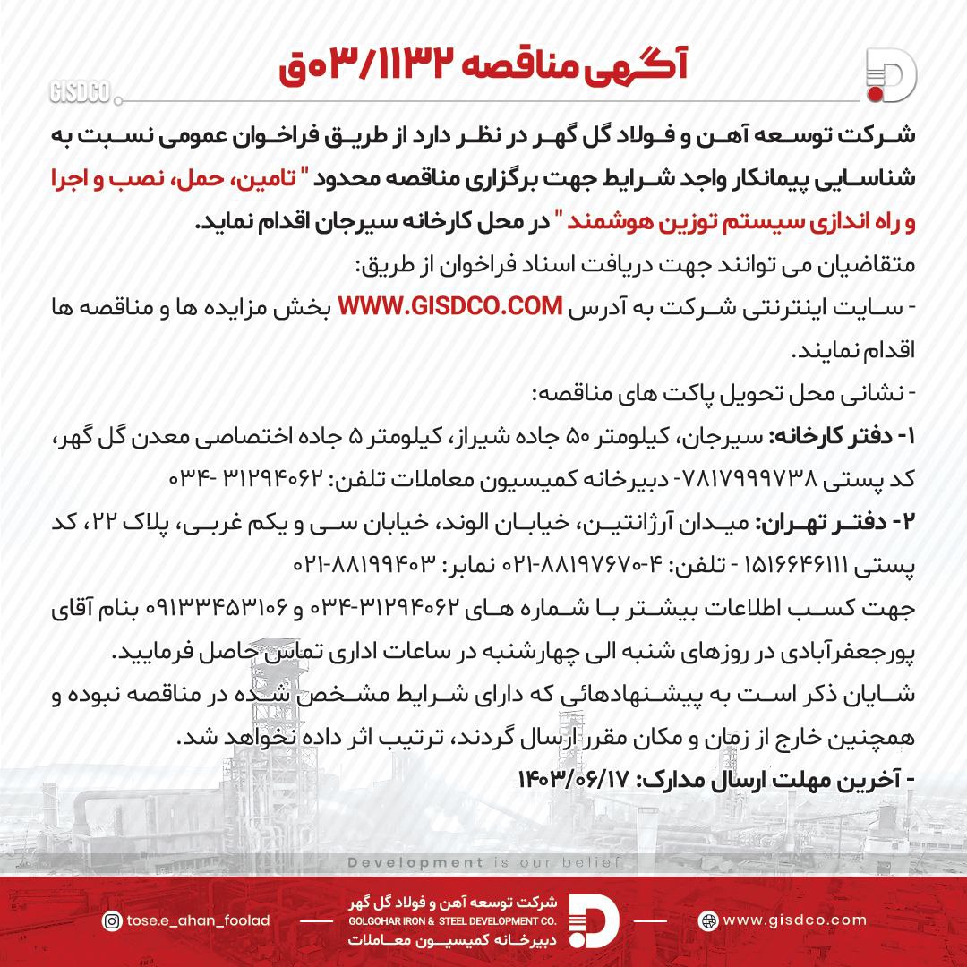 مناقصه ۰۳/۱۱۳۲ شناسه خبر: 19535 تاریخ و زمان ارسال: 30 مرداد 1403 ساعت 10:49 آگهی مناقصه ۰۳/۱۱۳۲تامین، حمل، نصب و اجرا و راه اندازی سیستم توزین هوشمند