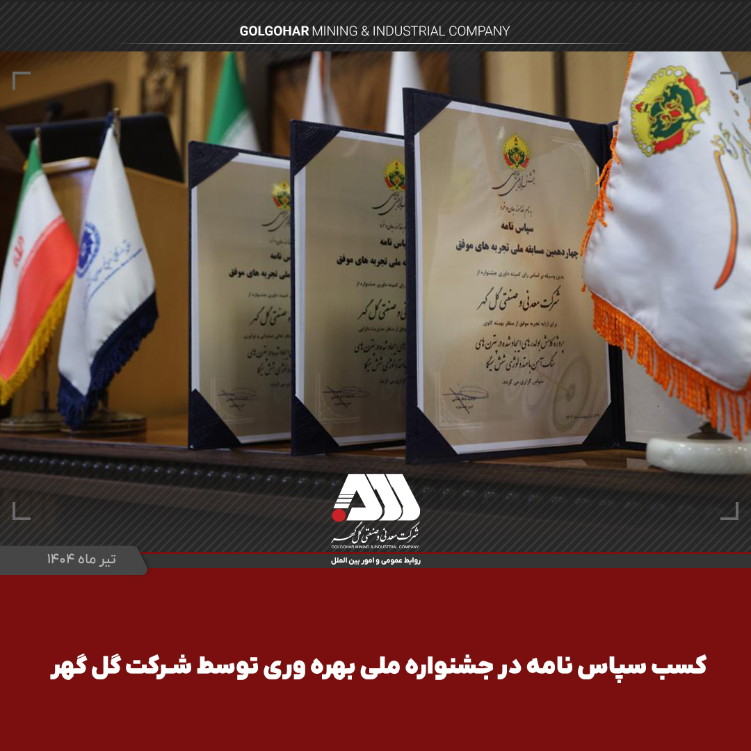 شرکت معدنی و صنعتی گل گهر در چهاردهمین جشنواره ملی بهره‌وری موفق شد ۳ سپاس نامه در حوزه های بهینه‌کاوی، تعالی عملیاتی و نوآوری و همچنین مدیریت دارایی را دریافت کند.