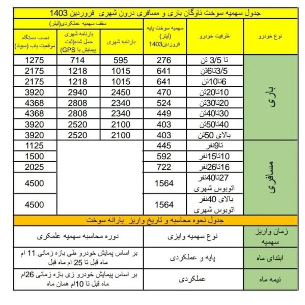 به گزارش واحدخبر مدیریت ارتباطات شهرداری سیرجان، جواد نویدی با اعلام این خبر افزود: ناوگان باری دیزلی شهری به منظور دریافت سهمیه سوخت باید ۳ مرحله را انجام دهند، در مرحله اول سهمیه پایه که براساس ظرفیت خودرو متغییر و مشمول خودروهایی میشود که در سامانه سراسری Utcms.ir ثبت نام و پروانه فعالیت و اشتغال را اخذ کرده اند که در جدول پیوست ستون سوخت پایه مشاهده می‌نمایید، مرحله دوم سوخت عملکردی که شامل خودروهای که پروانه فعالیت و اشتغال دارای اعتبار داشته و مشخصات بار و صاحب کالا را در سامانه باربرگ (پلتفرم) به صورت روزانه و لحظه ای ثبت شود که در جدول پیوست مقدار در ستون بارنامه شهری مشخص شده و مرحله سوم سوخت تکمیلی می باشد که مالکان علاوه بر ثبت مشخصات بار در پلتفرم باربرگ باید سخت افزار ثبت پیمایش (سیپاد) را روی خودرو نصب و پیمایش انجام شده به صورت آنلاین به ستاد سوخت ارسال می گردد. که مقدار تخصیص سوخت در ستون موقعیت یابی سیپاد قید شده است را رعایت کنند.