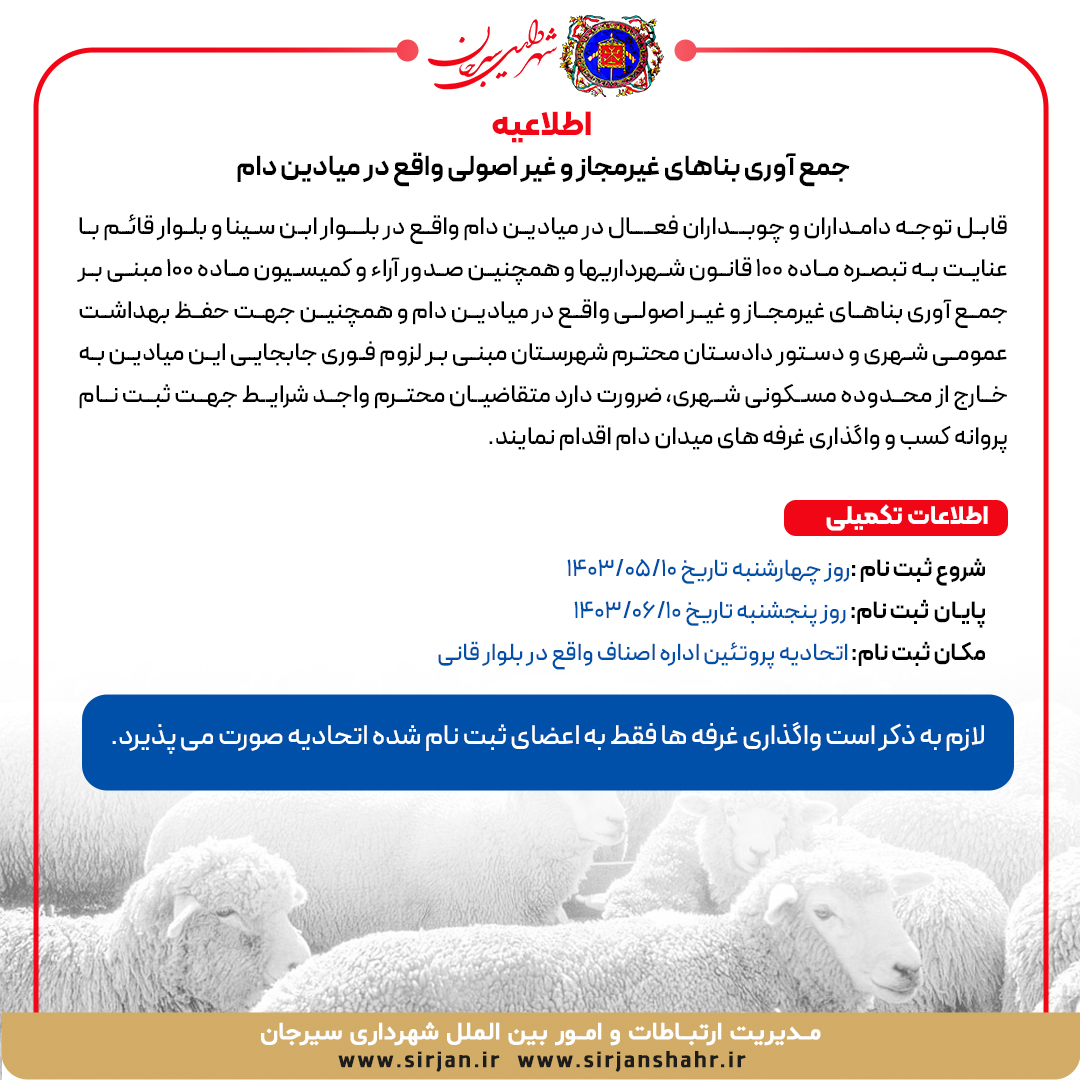 اطلاعیه در خصوص جمع آوری بناهای غیرمجاز و غیر اصولی واقع در میادین دام شناسه خبر: 20106 تاریخ و زمان ارسال: 9 مرداد 1403 ساعت 8:14
